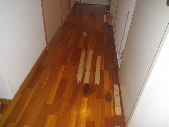 浴室からの漏水が床下に廻り、床下材が腐っていたため、床がきしんでいました。